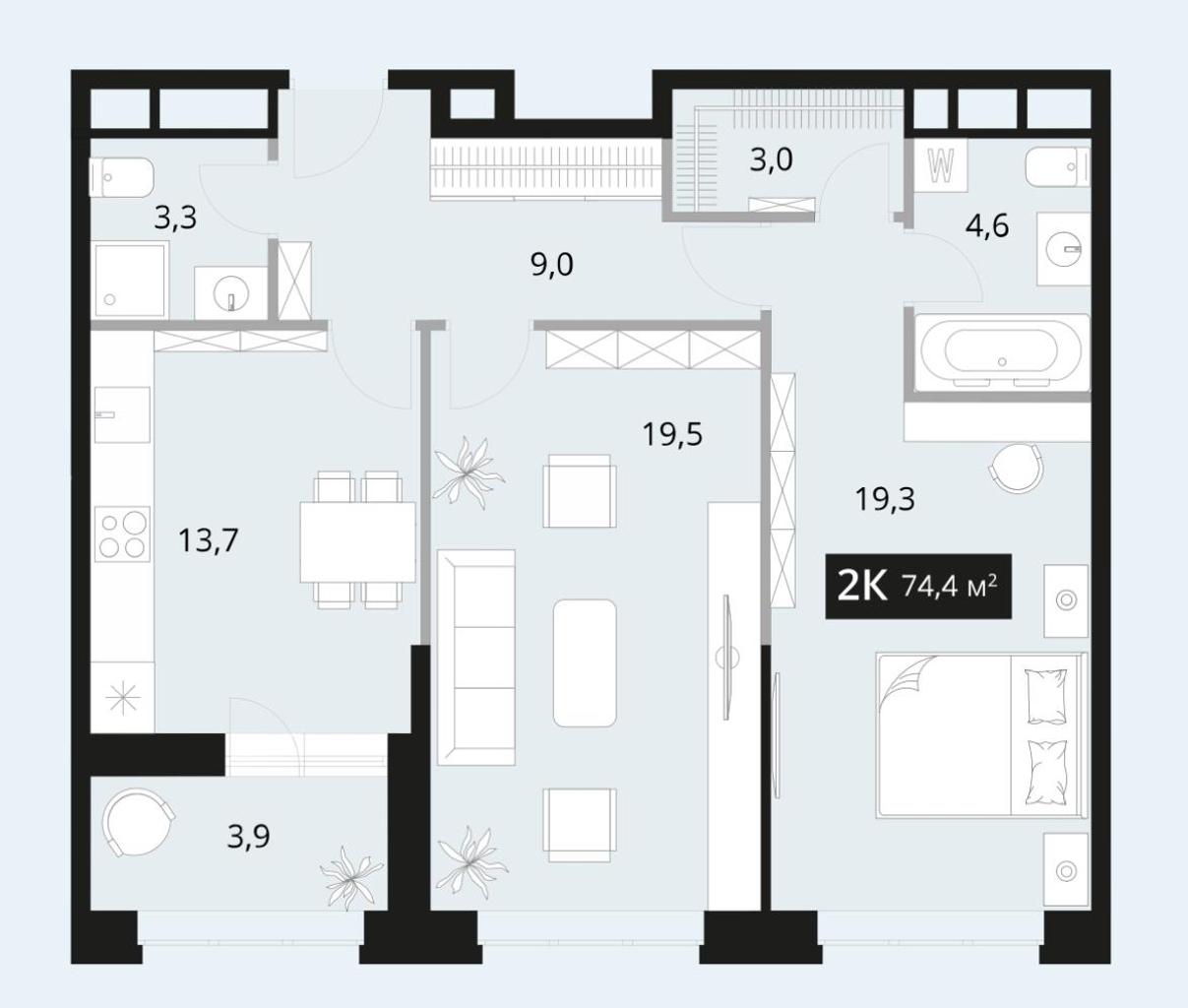 Идеальная планировка: Возможность создать евро-формат с двумя изолированными санузлами. Просторная кухня-гостиная станет центром притяжения, а уединенная мастер-спальня с собственной ванной комнатой — местом для отдыха. Витражное остекление на лоджии и высокие потолки создают ощущение простора и наполняют пространство светом.